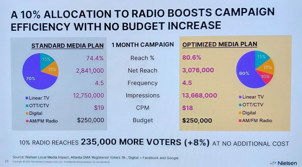 La ponencia enfatiza que para las elecciones legislativas de noviembre del 2022 en los Estados Unidos se van a invertir 7.8 mil millones de dólares en publicidad política. De este monto solo el 2.7% se piensa destinar a mensajes emitidos por radio AM y FM, cifra considerada muy baja si se tiene en cuenta que este medio sigue siendo uno de los vehículos más utilizados para llegar a importantes sectores de la sociedad.